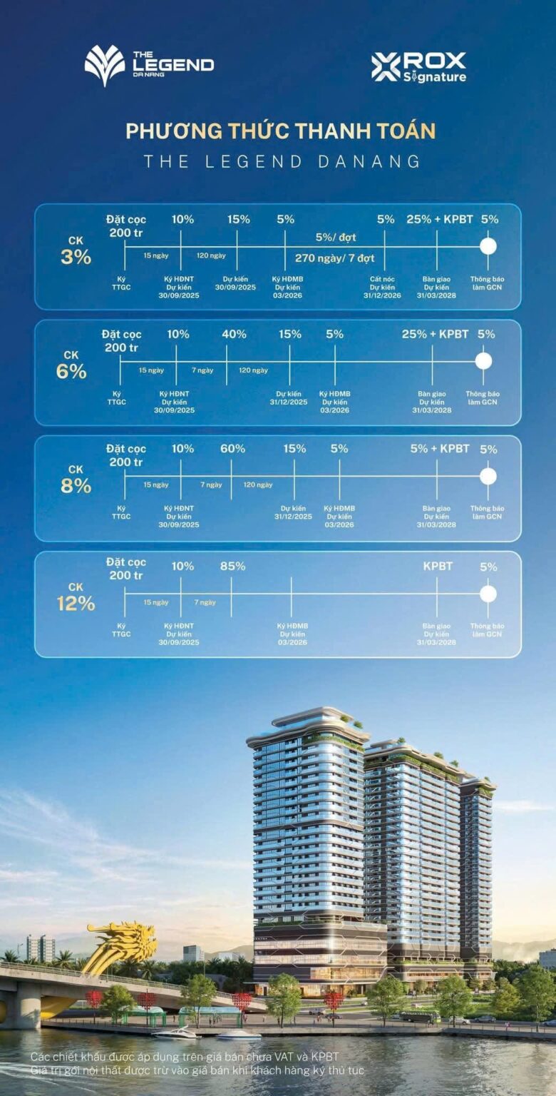 The Legend Đà Nẵng là một dự án căn hộ cao cấp, được quy hoạch bài bản với mật độ xây dựng hợp lý, mang đến không gian sống thoáng đãng và tiện nghi cho cư dân. Các căn hộ tại The Legend được thiết kế thông minh, tối ưu hóa diện tích sử dụng và đón ánh sáng tự nhiên. Dự án cung cấp đa dạng các loại hình căn hộ, từ studio, 1 phòng ngủ, 2 phòng ngủ, 3 phòng ngủ đến duplex và penthouse, đáp ứng nhu cầu của nhiều đối tượng khách hàng. Các căn hộ đều có ban công rộng rãi, mang đến tầm nhìn đẹp ra sông Hàn, biển Mỹ Khê và trung tâm thành phố.